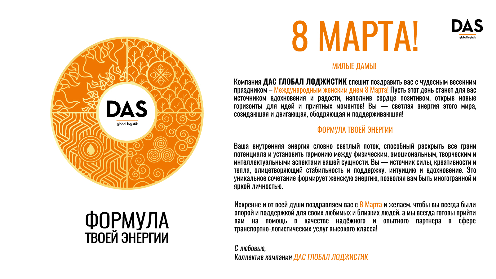 Компания ДАС ГЛОБАЛ ЛОДЖИСТИК спешит поздравить вас с чудесным весенним праздником – Международным женским днем 8 Марта! Пусть этот день станет для вас источником вдохновения и радости, наполнив сердце позитивом, открыв новые горизонты для идей и приятных моментов! Вы — светлая энергия этого мира, созидающая и двигающая, ободряющая и поддерживающая!